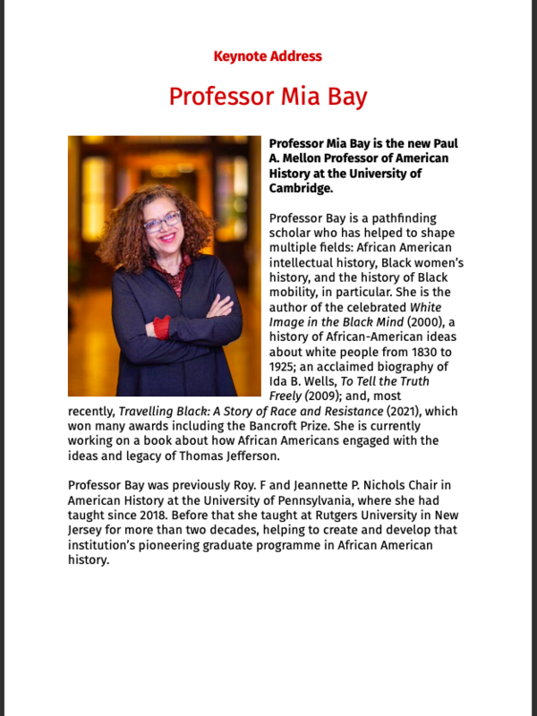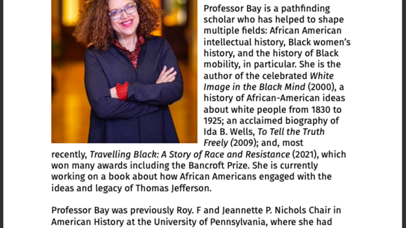 The keynote address will be delivered by Professor Mia Bay, and the four panels will bring together a brilliant group of emerging scholars in the field of political thought and intellectual history.